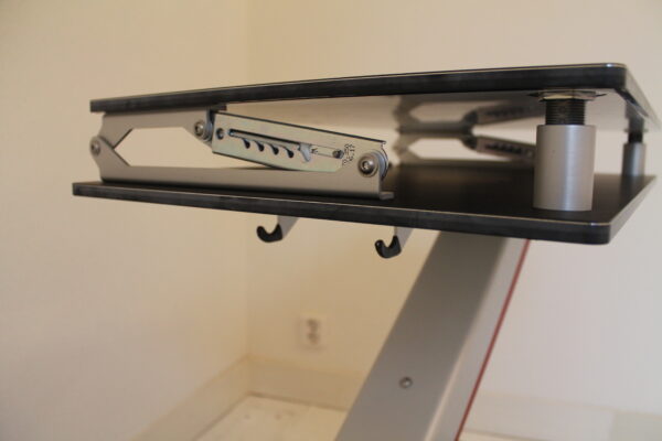 Scanner and power supply can be stored at the lower shelf while the top shelf offers room for the MacBook Pro, Tracker and mouse.